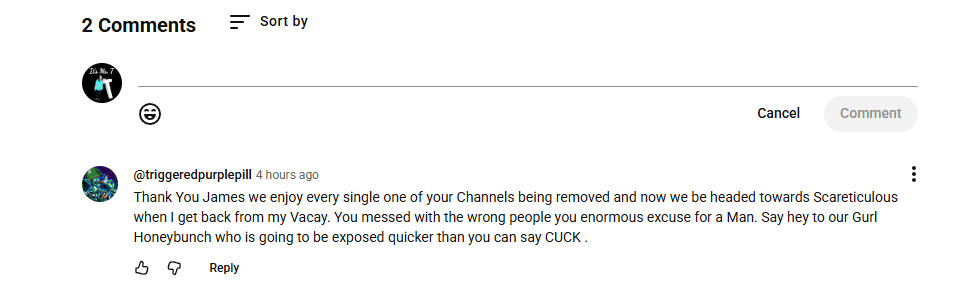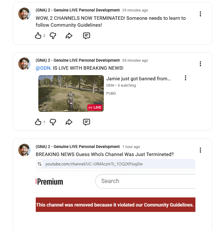 This is another tactic that Mr. Melas and his “enforcer,” Cole Cortner, use. Last evening, they had channels falsely shut down for impersonation. These channels belong to the same person Mr. Melas is in court with, and has been trying to silence their First Amendment rights to commentary and criticism. 3 or 4 days prior to this, Mr. Melas was heard saying that, in 3 days, channels would go down. This, in my opinion, is criminal.