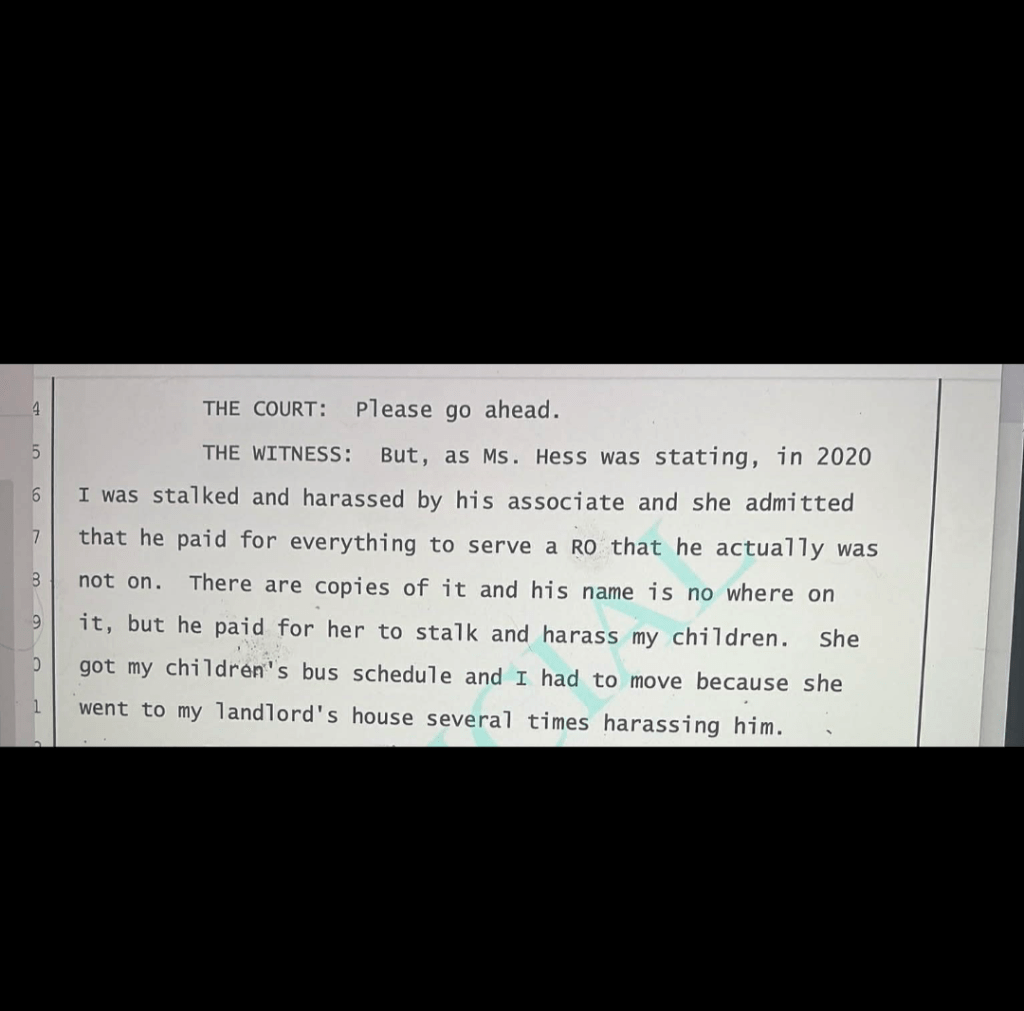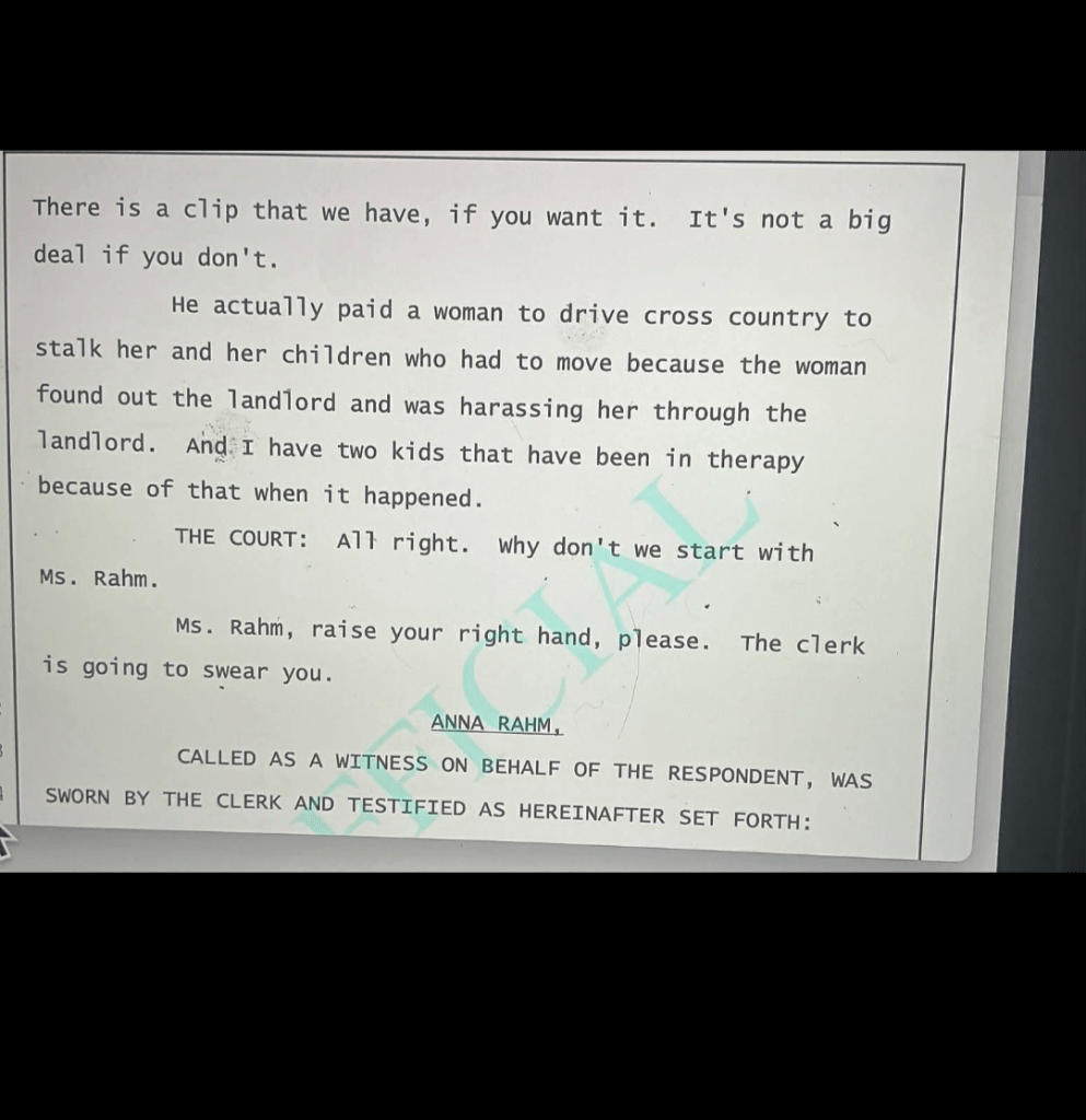 This is a screenshot from a transcript during an RO hearing Mr. Melas was trying to get on me while he was trying to silence my right to free speech. I had a witness, Anna, who Mr. Melas paid people to drive cross country to harass and stalking Anna, her then boyfriend, and her young children. It got so bad that she had to move her children!
